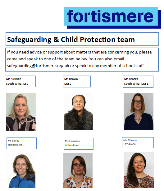 Students are able to talk to any member of staff about concerns they may have. Posters are displayed around the school that show our Safeguarding and Child Protection Team, so students know where staff are located. Students and parents can also email: safeguarding@fortismere.org.uk at any time.